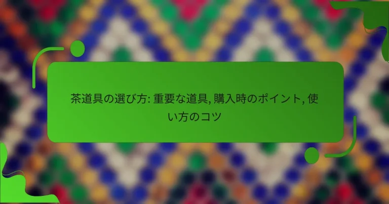 茶道具を選ぶ際には、種類や使用目的、予算、品質、ブランドの信頼性を考慮することが重要です。これらの要素をしっかりと理解することで、自分に最適な道具を見つけることができ、茶の体験をより豊かにすることができます。 茶道具を選ぶ際の重要なポイントは何か? 茶道具を選ぶ際には、種類、使用目的、予算、品質、ブランドの信頼性が重要です。これらの要素を考慮することで、自分に合った道具を見つけることができます。 茶道具の種類と役割 茶道具には、茶碗、茶筅、茶杓、釜、そして水差しなど、さまざまな種類があります。各道具は、茶を点てる過程で特定の役割を果たします。 例えば、茶碗は茶を入れるための器であり、茶筅は茶を泡立てるために使用します。これらの道具の役割を理解することで、必要なものを選ぶ手助けになります。 使用目的に応じた選択基準 茶道具を選ぶ際は、使用目的を明確にすることが重要です。例えば、日常的に使うのか、特別な行事用なのかによって、選ぶべき道具が異なります。 日常使いの場合は、耐久性があり手入れが簡単な道具を選ぶと良いでしょう。一方、特別な場面では、見た目や伝統を重視した高級な道具が適しています。 予算に応じた茶道具の選び方 茶道具の価格は幅広く、数千円から数十万円まで様々です。予算に応じた選択が必要です。 初めて茶道を始める場合は、手頃な価格の道具から始めることをお勧めします。慣れてきたら、徐々に高品質な道具に移行するのが良いでしょう。 品質と素材の重要性 茶道具の品質は、使用感や茶の味に大きく影響します。特に、陶器や漆器の素材は、茶の風味を左右します。 高品質な道具は、長持ちし、使用するたびに満足感を得られます。素材選びには、信頼できるメーカーの製品を選ぶことが重要です。 ブランドの信頼性と評判 茶道具を選ぶ際には、ブランドの信頼性も考慮すべきです。歴史のあるブランドや、茶道具専門のメーカーは、品質が保証されていることが多いです。 購入前に、他のユーザーのレビューや評価を確認することで、失敗を避けることができます。特に、初心者の場合は、評判の良いブランドを選ぶと安心です。 どのように茶道具を使うのか? 茶道具を使う際は、道具の特性を理解し、正しい手順で扱うことが重要です。これにより、茶の味わいや体験を最大限に引き出すことができます。 基本的な使い方の手順 茶道具の基本的な使い方は、まず道具を清潔に保つことから始まります。次に、茶葉を適切な量用意し、湯を沸かしておきます。その後、茶碗に茶葉を入れ、熱湯を注ぎ、数分間待ってから茶を点てます。 この手順を守ることで、茶の風味を引き出し、より良い体験が得られます。特に、湯の温度や茶葉の量は、茶の種類によって調整が必要です。 道具ごとの使用方法の違い 茶道具には、茶碗、茶筅、茶杓など、さまざまな種類があります。それぞれの道具には特有の使い方があり、例えば茶筅は泡立てるために、茶杓は茶葉をすくうために使用されます。 道具ごとの使用方法を理解することで、茶を点てる際の精度が向上します。特に、茶筅の動かし方や茶杓の角度は、茶の味に大きな影響を与えます。 茶道具のメンテナンス方法 茶道具のメンテナンスは、長持ちさせるために欠かせません。使用後は、すぐに洗浄し、乾燥させることが重要です。特に、茶碗や茶筅は水分が残ると劣化しやすくなります。 定期的に道具を点検し、必要に応じて修理や交換を行うことも大切です。これにより、常に良好な状態で茶道具を使用することができます。 初心者向けの使い方のコツ 初心者は、まずはシンプルな道具から始めると良いでしょう。基本的な茶碗と茶筅を用意し、少量の茶葉で練習することで、徐々に自信をつけることができます。 また、他の人の茶を見学することも有効です。実際の動作を観察することで、正しい手順やコツを学ぶことができます。失敗を恐れず、楽しむことが大切です。 茶道具の購入時に注意すべき点は何か? 茶道具を購入する際は、品質、価格、購入先の信頼性を重視することが重要です。これにより、長く使える道具を手に入れることができます。 購入先の選び方 ....
