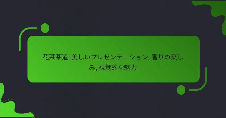 花茶茶道は、花と茶を融合させた日本の伝統文化で、視覚的な美しさと香りの楽しみを重視しています。この茶道では、茶を淹れる過程だけでなく、花の配置や選び方が重要な要素となり、参加者に深い印象を与える豊かな体験を提供します。 花茶茶道とは何か? 花茶茶道は、花と茶を組み合わせた日本の伝統的な文化で、視覚的な美しさと香りの楽しみを重視しています。この茶道は、茶を淹れる過程だけでなく、花の配置や選び方にも焦点を当てています。 花茶茶道の定義と起源 花茶茶道は、茶道の一形態であり、花を用いた美しいプレゼンテーションが特徴です。この文化は、日本の古典的な茶道の影響を受けつつ、独自の発展を遂げてきました。 起源は、平安時代にさかのぼり、当時の貴族たちが茶と花を楽しむために始まったとされています。特に、茶会での花の役割が重要視されるようになったのは、江戸時代からです。 花茶茶道の主要な要素 花茶茶道の主要な要素には、茶、花、器、そして空間が含まれます。茶は通常、抹茶や煎茶が用いられ、花は季節に応じたものが選ばれます。 器は、茶を淹れるための茶碗や花を生けるための花器が重要で、全体の美しさを引き立てる役割を果たします。空間の配置や雰囲気も、体験を豊かにするために考慮されます。 花茶茶道の文化的意義 花茶茶道は、日本の美意識や自然との調和を反映しています。花と茶を通じて、参加者は心を落ち着け、感謝の気持ちを育むことができます。 また、花茶茶道は社交の場としても機能し、人々が集まり、交流を深める機会を提供します。このように、文化的な意義は深く、日常生活における精神的な豊かさをもたらします。 花茶茶道の実践方法 花茶茶道を実践するには、まず適切な花と茶を選ぶことが重要です。季節に応じた花を選び、茶は好みに合わせて選びます。 次に、茶を淹れる際は、温度や時間に注意を払い、茶の風味を最大限に引き出します。花は美しく生けることが求められ、全体のバランスを考慮することが大切です。 花茶茶道の種類 花茶茶道には、さまざまなスタイルがあります。例えば、形式的な茶会で行われる「茶道式」や、よりカジュアルな「家庭式」があります。 また、特定の季節や行事に合わせたテーマを持つ茶会も存在し、参加者はそのテーマに沿った花や茶を楽しむことができます。これにより、花茶茶道は常に新しい体験を提供します。 花茶茶道の美しいプレゼンテーションはどう作るか? 花茶茶道の美しいプレゼンテーションは、視覚的な魅力と香りの楽しみを融合させることが重要です。これにより、茶道の体験がより豊かになり、参加者に深い印象を与えることができます。 プレゼンテーションの基本要素 花茶茶道のプレゼンテーションには、器具、花茶、そして環境が基本要素として含まれます。これらの要素が調和することで、全体的な美しさが引き立ちます。 特に、器具は清潔で整然としていることが求められます。花茶は新鮮で香り高いものを選び、視覚的にも楽しませるようにします。 視覚的な配置とデザインのポイント 視覚的な配置は、花茶茶道の印象を大きく左右します。器具や花茶は、参加者の目に留まるように配置し、バランスを考慮することが重要です。 デザインにおいては、シンプルさが美しさを引き立てます。余計な装飾を避け、自然な美しさを強調することがポイントです。 器具と花茶の選び方 器具の選び方は、花茶茶道の体験において非常に重要です。陶器やガラスなど、素材によって異なる印象を与えるため、テーマに合わせた選択が求められます。 花茶は、色や香りが豊かなものを選ぶと良いでしょう。特に、視覚的に美しい花びらが含まれているものは、プレゼンテーションを一層引き立てます。 色彩の重要性と組み合わせ 色彩は、花茶茶道のプレゼンテーションにおいて重要な役割を果たします。色の組み合わせは、全体の雰囲気を決定づけるため、慎重に選ぶ必要があります。 例えば、淡い色合いの器具には、鮮やかな花茶を合わせることで、視覚的なコントラストを生み出すことができます。色の調和を意識し、参加者に心地よい印象を与えましょう。 花茶茶道の香りの楽しみ方は? 花茶茶道では、香りを楽しむことが重要な要素です。香りは茶の種類や淹れ方によって異なり、心地よい体験を提供します。 香りの種類と特徴 ....